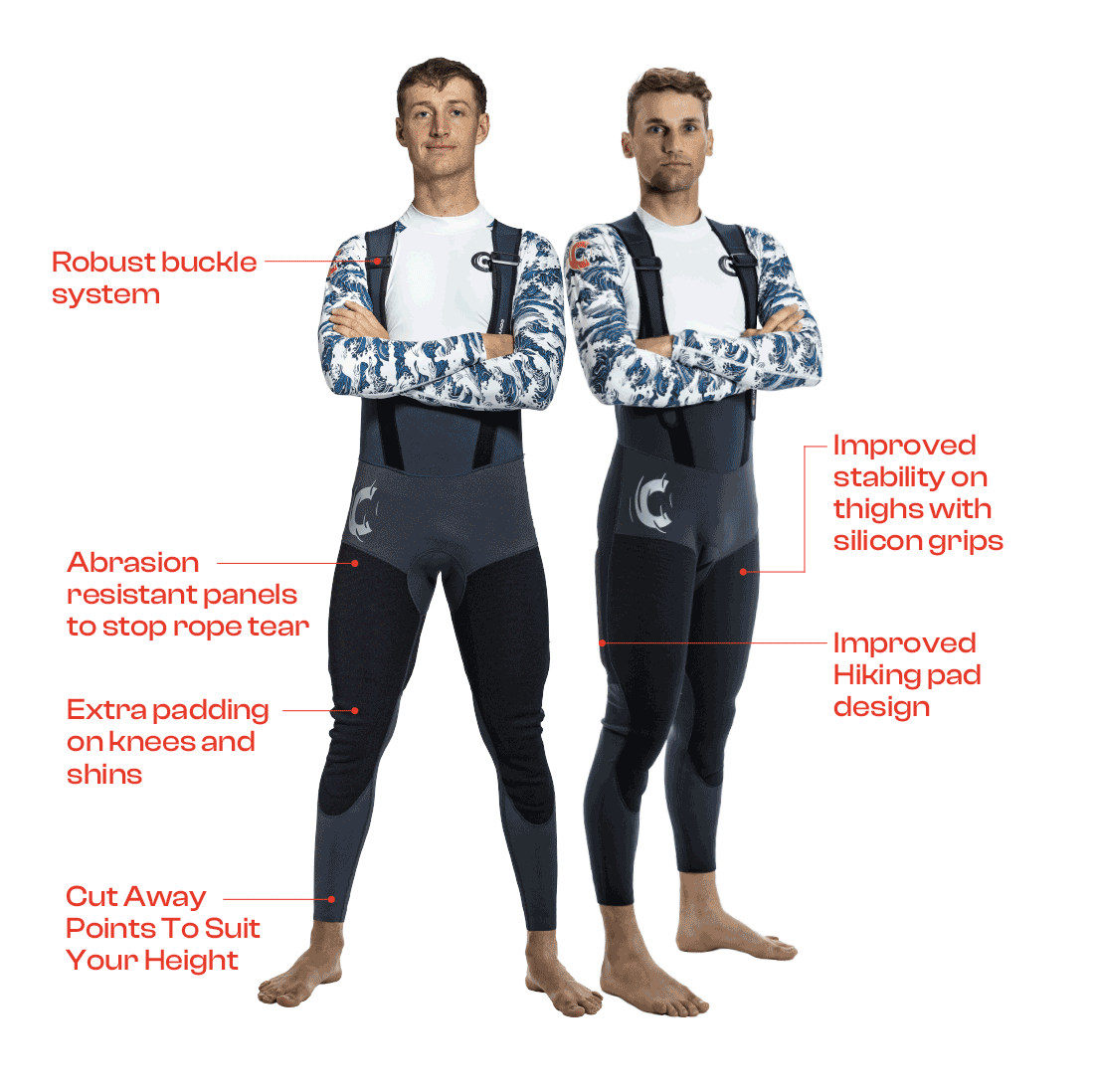 The Covy Mens Thermos Hikers are designed for pure performance. Made from 4/3mm neoprene, with inbuilt fibreglass batten pads, internal extra pad pocket, reinforced and padded knees / shins, abrasion protection on the upper thigh to stop rope tear, stability grips on inside of thigh and cut away points on the legs to cut to your size. The Covy Thermos Hikers have been designed in collaboration with our best athletes and tested at the highest levels to ensure they perform no matter the conditions.